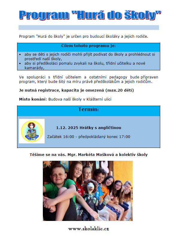 Srdečně zveme předškoláky a jejich rodiče na společné setkání u nás ve škole "Hurá do školy" dne 1. 12. 2025 od 16:00