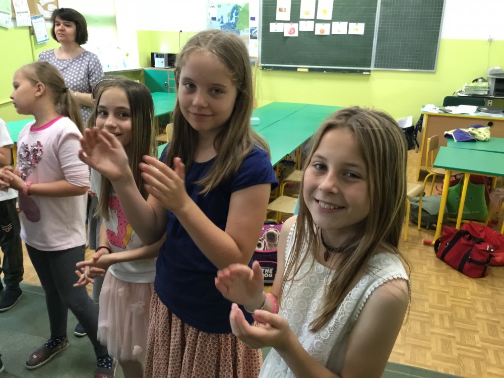 První den ve škole nás všichni zdravili. Já, Vilma a Eliška jsme šly do třetí třídy a s nimi jsme šli na hodinu tělesné výchovy, ale bohužel jsme necvičily, jenom jsme se koukaly. Druhou hodinu se žáci učili polštinu, ale moc jsem tomu nerozuměla. Po škole jsme šli na radnici za starostou, který nás přivítal v Ležajsku. Také jsme tam dostali malé dřevěné hračky. Ve škole pro nás připravili žáci přivítaní, kde každý žák představil jednu zemi. Před obědem jsme si hráli s novými hračkami. Potom nás nechali prohlédnout si školu a také jsme tvořili zvířata z keramiky, TO BYLO SUPER!